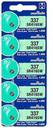 he Murata 337 (SR416SW) is a 1.55V silver oxide button cell battery. It has the following key specifications:. Voltage: 1.55V. Capacity: 8.3mAh. Chemistry: Silver Oxide. Terminal Type: Pressure Contact. Shelf Life: 5 Years. Packaging: Tear Strip. Brand: Murata. Product Weight: 0.13 grams. Product Dimensions: 1.65mm (L) x 4.8mm (Diameter. Applications: Watches, calculators, medical devices, remote controls, and other small electronics. Reliable, long-lasting power source for compact devices.