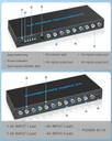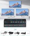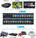 ?4-way RCA composite video splitter?4 port RCA Switch Box splits 4 audio video analog signals into 3 TV monitors /projectors for multiple viewing monitors or dubbing projects. Note: Each display will show the same picture, just mirror or duplicate the input source, not support extend, not matrix.