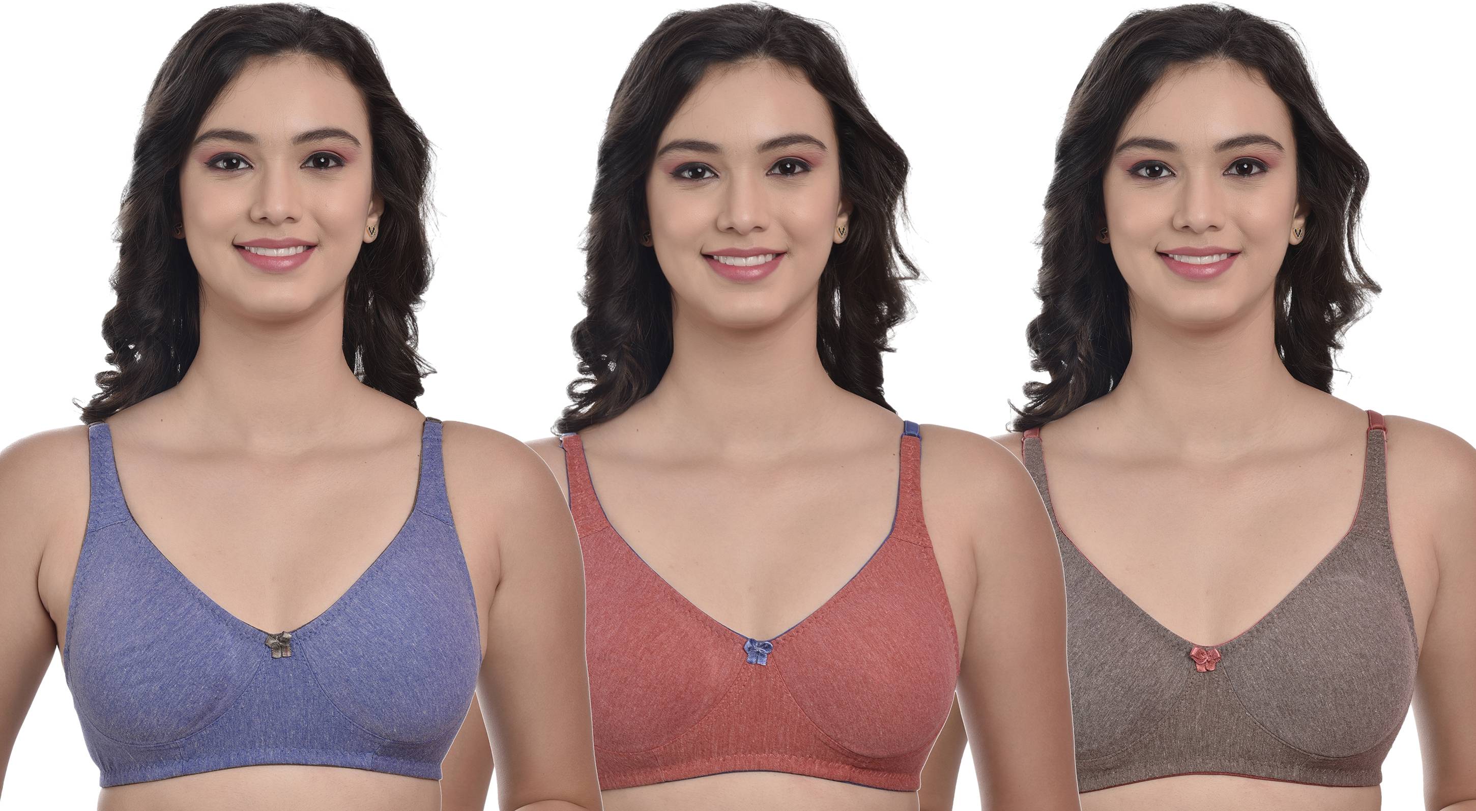 Each set includes a t-shirt bra paired with low rise hipster panties in three stunning colors: