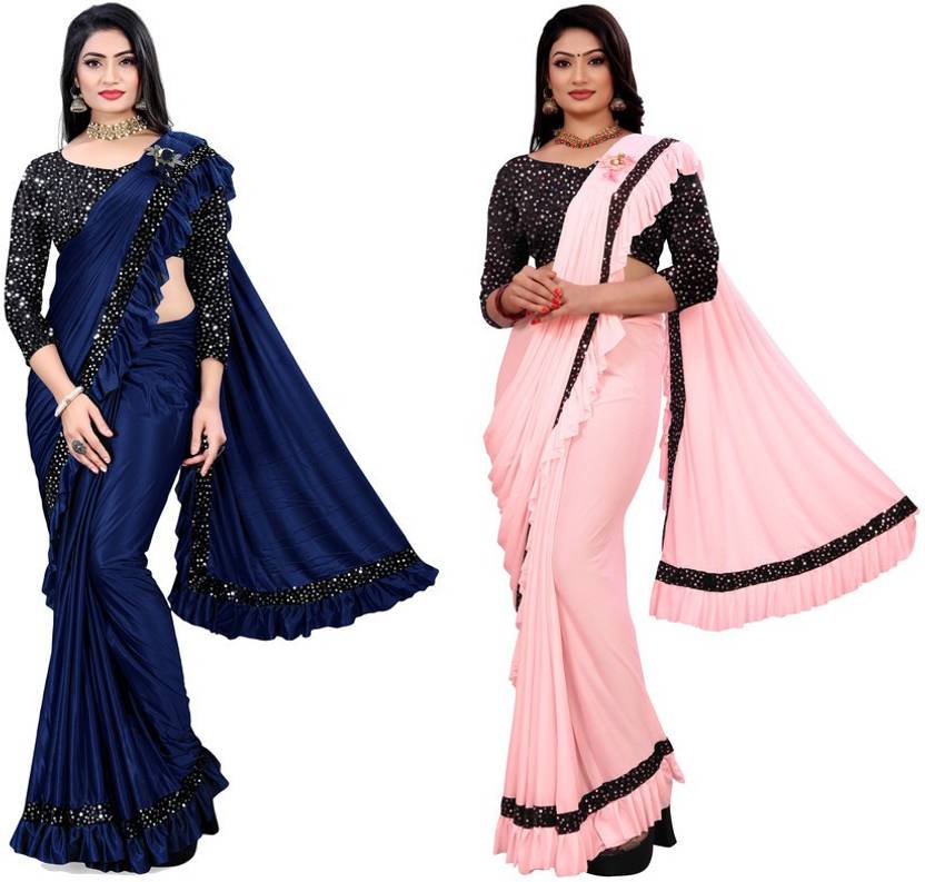 MIJAASHREE Solid/Plain Bollywood Lycra Blend Saree (Pack of 2, Pink, Blue)