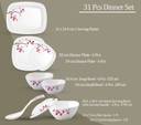 31-Pcs Dinner Set (cms) (6 Pcs Dinner Plates-28, 6 Pcs Small Plates-19, 6 Pcs Soup Bowls-10.4, 6 Pcs Small Bowls-9.6, 2 Pcs Serving Bowls-20.3, 2 Pcs Serving Bowl Lids-20.5, 1 Pc Serving Platter-31 x 24.9, 1 Pc Rice Spoon-24 x 7.6, 1 Pc Serving Spoon-24 x 7)