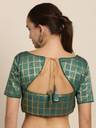 Teal green and golden embellished padded blouse, has a boat neck, short sleeves, a back with tie-up detail and has zip closure at side