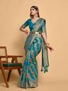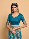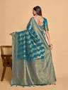Teal color Traditional Saree, With Woven Zari design All over , Has Zari woven border and pallu and Tussel Work at the end , Comes With Teal Color Running Unstiched Blouse (Included In sarees Length 5.40 Mtr+.80 Cm)
