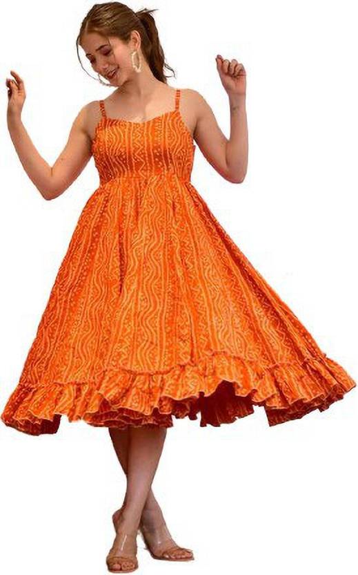 Women Bandhani Cotton Rayon Anarkali Kurta (Orange)