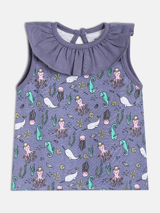 Get this sassy little purple top from MINIKLUB Kids for your angel and she is sure to be in the limelight. Beautifully crafted from cotton fabric with a printed pattern, this round neck with sleevesless top is attractive and comfortable. Team this top with a pair of pants to complete the look.
