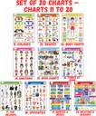 | Sales Package | - Set of 20 Charts, English Alphabet Chart, Numbers Chart, Fruits Chart, Vegetables Chart, Flowers Chart, Farm Animals, Wild Animals, Birds Chart, Insects Chart, Transport Chart, Colors Chart, Shapes Chart, Body Parts Chart, Emotions Chart, Good Habits Chart, Things at home, Our Helpers, Opposites, Months of the Years, Weeks of the month, Weather and season