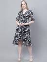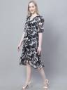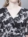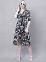 Mini & Ming Women's Black Rose Printed Wrap Party Wear Midi Dress with attached cotton lining, has a V-neck, 3/4th sleeves and asymmetrical hem.