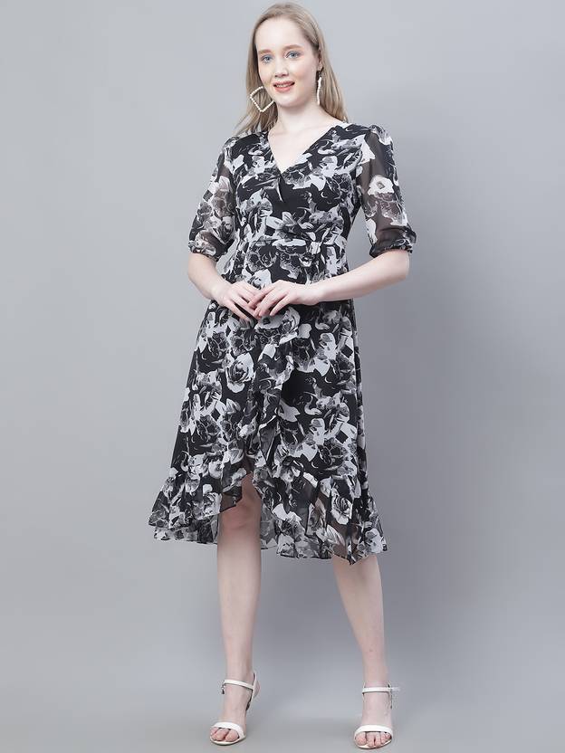 Women Wrap Black, White Below Knee Dress