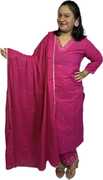 Our stunning green 3-piece suit set, featuring delicate pearl, thread, and sequin work on the neck and sleeves of a V-neck kurti. Paired with a comfortable elasticated pant and a coordinating dupatta enhanced with thread and sequin work.