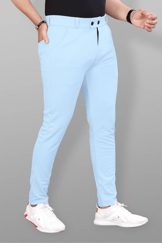 Men Slim Fit Light Blue Lycra Blend Trousers