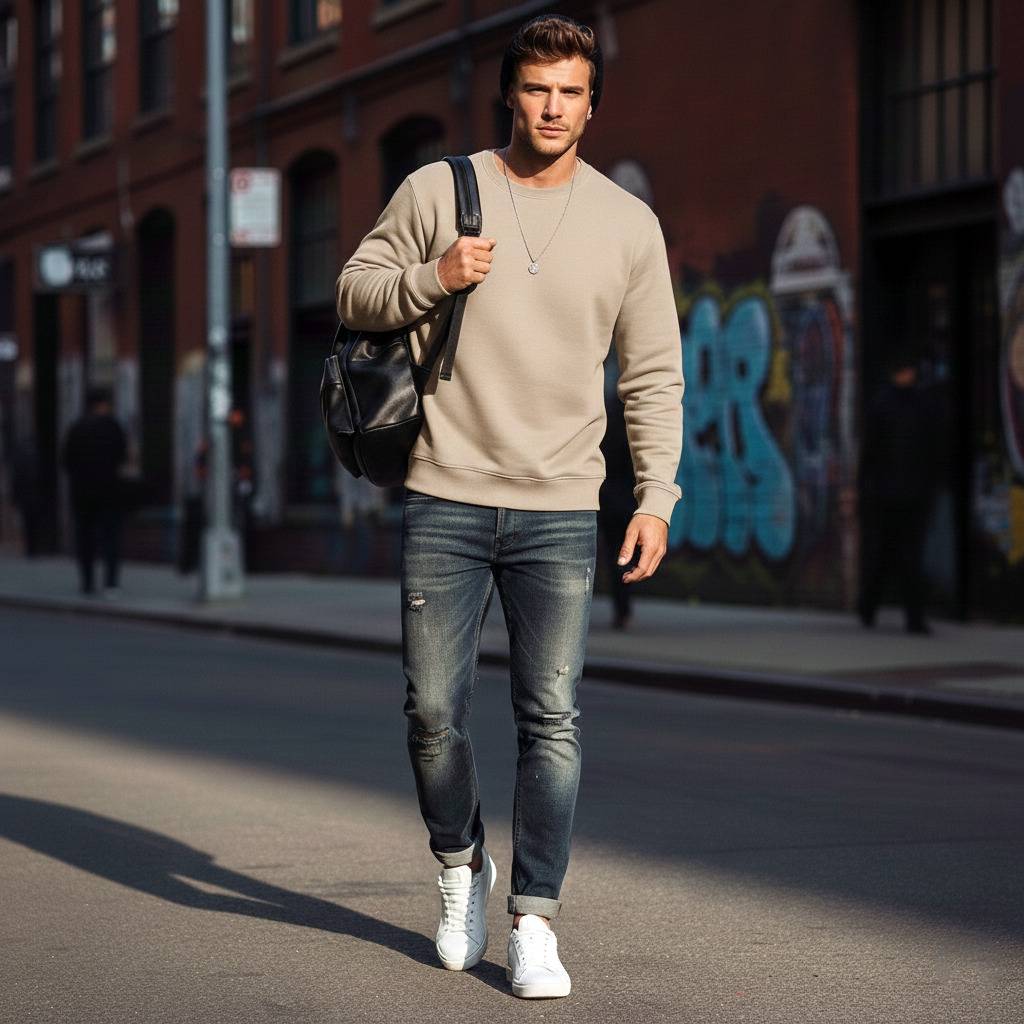 This men's sweatshirt features a classic crewneck design in a versatile colours, offering a comfortable and relaxed fit. Crafted from a soft fabric, it is ideal for everyday casual wear. The simple, solid design makes it a foundational piece for various outfits. Compatible products include: distressed blue jeans, white sneakers, black beanies, and black backpacks.