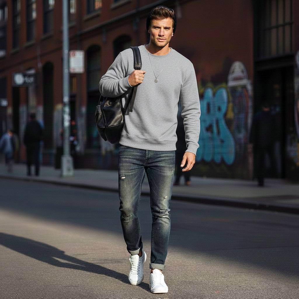 This men's sweatshirt features a classic crewneck design in a versatile colours, offering a comfortable and relaxed fit. Crafted from a soft fabric, it is ideal for everyday casual wear. The simple, solid design makes it a foundational piece for various outfits. Compatible products include: distressed blue jeans, white sneakers, black beanies, and black backpacks.