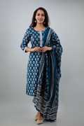 Owing to its exquisite detailing, the kurta in this set boasts a classic round neck, three-quarter sleeves, and a straight cut that accentuates your silhouette with grace. Designed beautifully, the calf length of the kurta in this set adds a touch of sophistication to your ensemble. Paired with these, the pants in this set offer a comfortable fit, ensuring ease of movement throughout the day. Moreover, the dupatta in this set features ample length, allowing you to drape it effortlessly and complete your look with finesse.