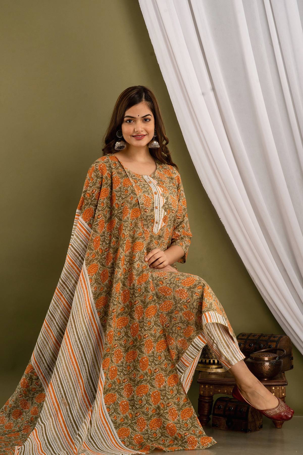 Thanks to its beautiful pattern, this women’s kurta, pants, and dupatta set showcase a delightful printed floral design that adds a touch of elegance to any wardrobe. Moreover, each piece is meticulously designed to showcase its intricacy, making it a must-have addition to your wardrobe.