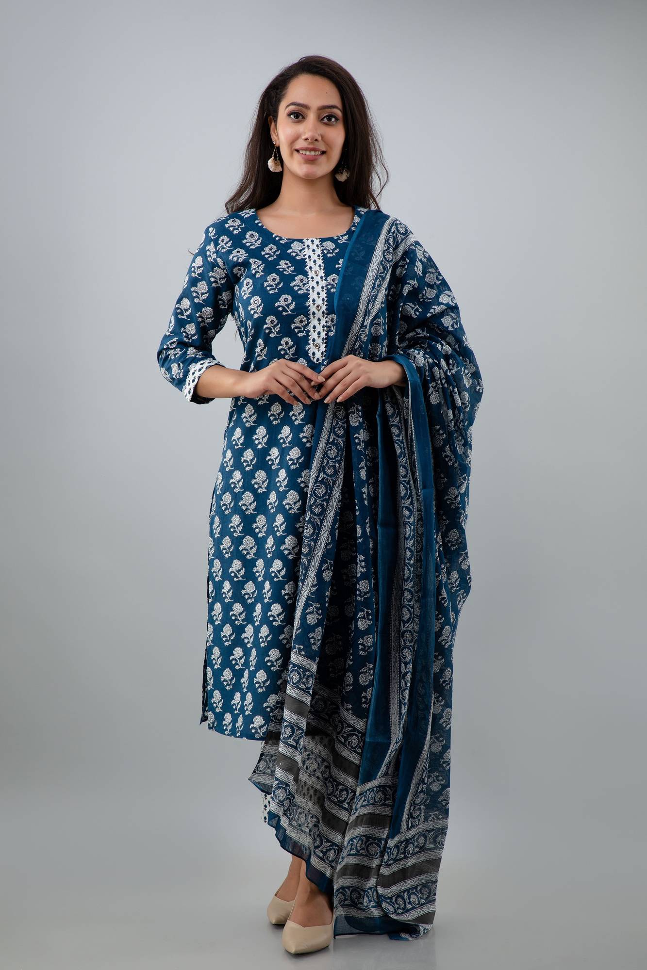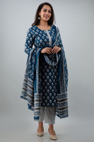 Crafted from soft cotton fabric, this ensemble offers a delightful wearing experience, which makes it ideal for extended hours of wear. And, the breathable, comfortable fabric adds to its appeal, which makes it suitable for both festivities and daily wear.