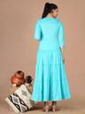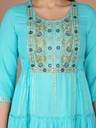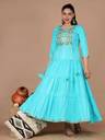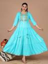 Cuffed sleeve, Gold print with Blue Border, On front Aari or Adda Work, Anarakli Kurta with three fourth seeleve, Full falred Kurti