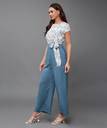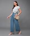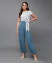 Multicolored-Base-Azure Blue floral printed knotted regular length waist tie-up jumpsuit, Has round neck and short sleeves.