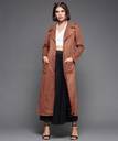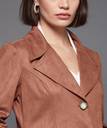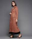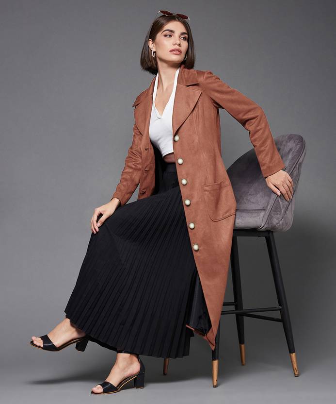 Dusty Peach Notch-Collar Button-Down Longline Polyester Jacket with Full Sleeves for Women. It Has Patch Pockets.