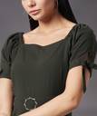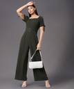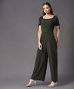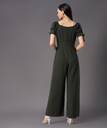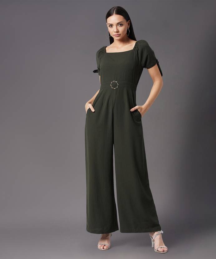 Dark Green Polyester Solid Wide Leg Regular Jumpsuit. Has a square neck and puff sleeves. Has a tie-up detailing on sleeve hem and buckle detailing on waist.