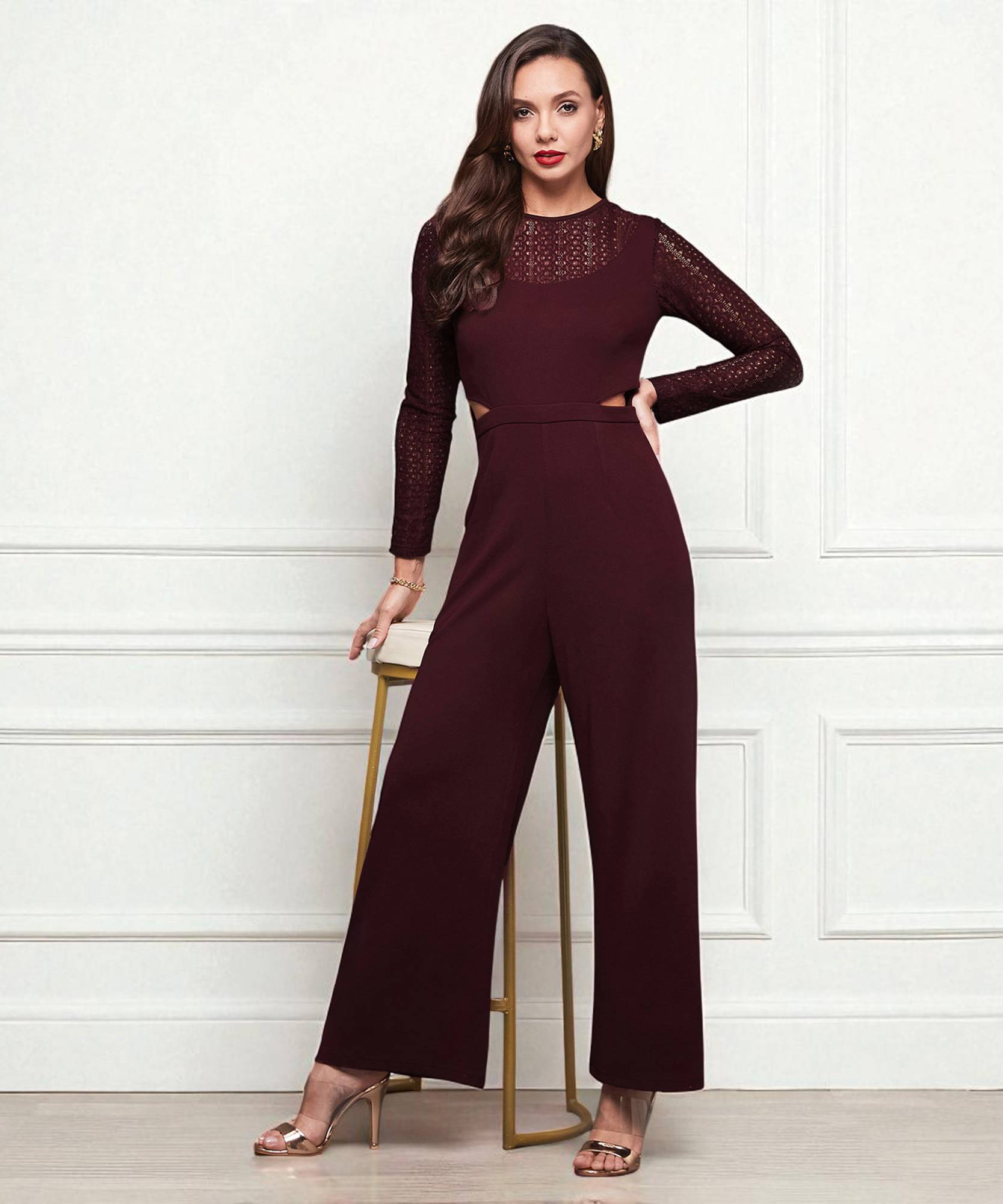 Wine Round Neck Full Sleeve Self Design Cut-out Regular-Length Polyester Jumpsuit. It Has Waist Cut-out and Zip Closure.