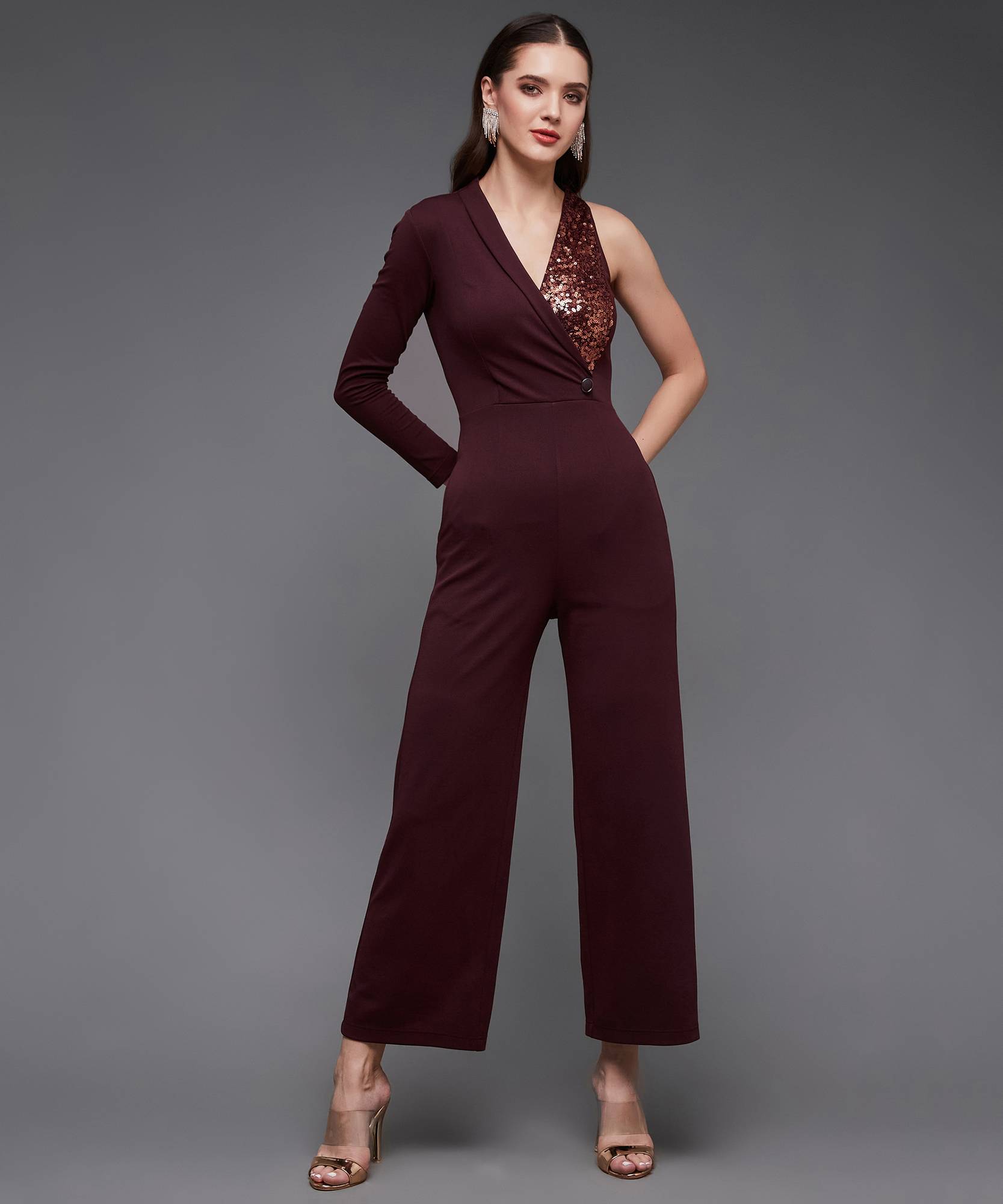 Wine Polyester Embellished Regular Blazer Shawl Collar Slim Fit Jumpsuit. Has 2-side pockets, Asymmetric sleeves and a Zipped Closure