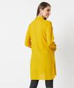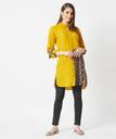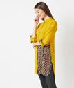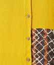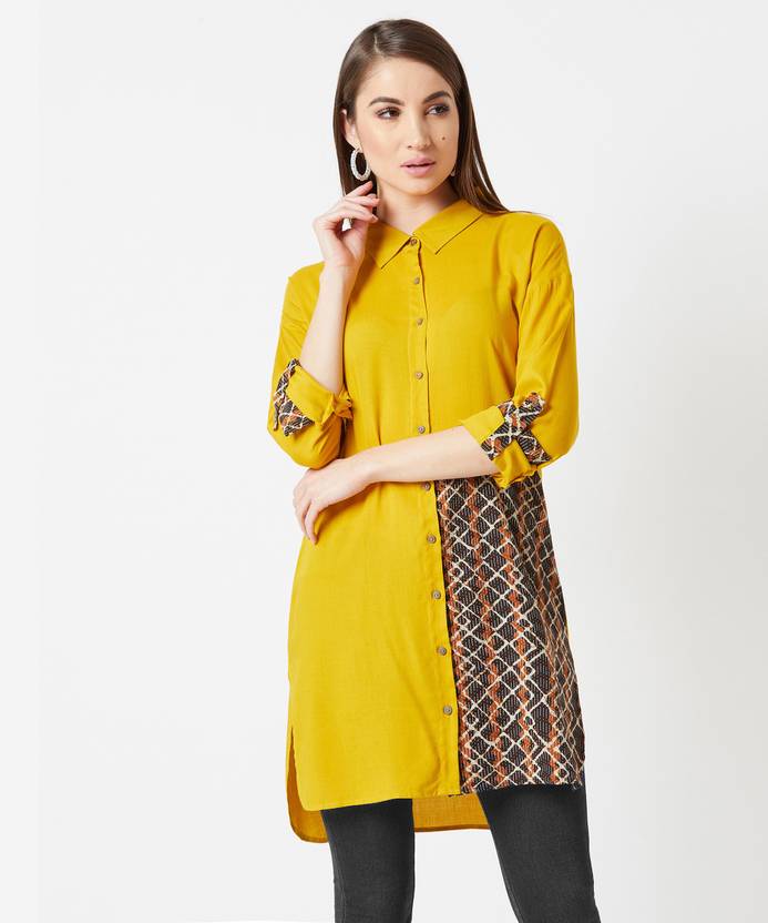 Multicoloured base mustard rayon abstract knee length Color-Block shirt dress,Has a shirt collar and full roll up sleeves,Has a wooden buttoned closure
