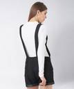 Black denim regular length mid rise regular length non-stretchable dungaree, Has 5 pockets and a buttoned closure.