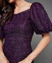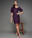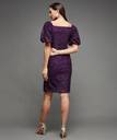 Dark Purple Colored Self-Designed Mini Bodycon Polyester Dress. It Has Square Neck And Half Sleeve. It Has Zip Closure.