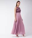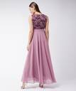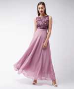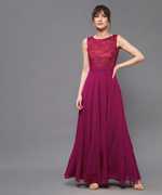 Lavender polyester Solid Lace Overlaid Maxi Dress. Has a Round neck and is Sleeveless. Has a contrasted lace yoke.