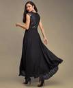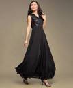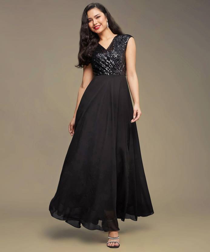 Black sequin solid flared wrap style maxi dress, Has V-neck with cap sleeves and zip closure.