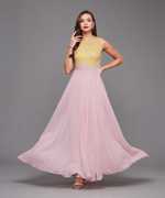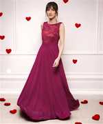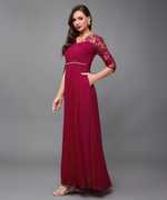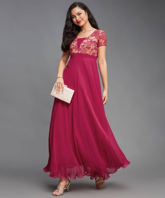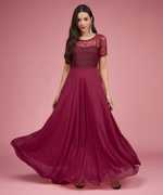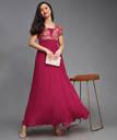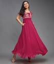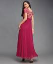 Dark Pink Self-Designed Square Neck Georgette Maxi Relaxed Fit Dress. It Has Raglan Short Sleeve. It Has Back Concealed Zipper. It Has 2 Side Pockets.