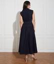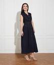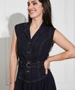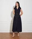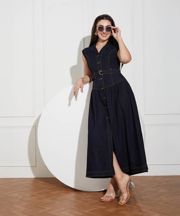 Dark blue maxi-length light weight denim shirt dress featuring a notched collar, sleeveless design, and drop waist with a self-belted fit-and-flare silhouette. A versatile, fashion-forward piece blending formal elegance with trendy Gen-Z appeal.