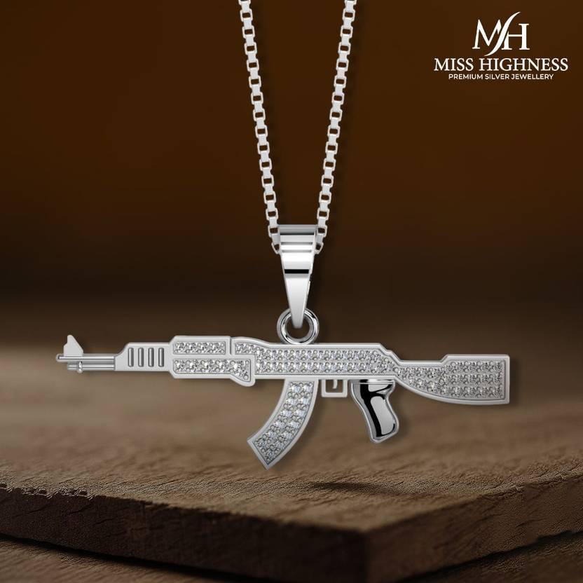 Men’s AK47 Design Necklace – Rhodium Plated Silver with Cubic Zirconia Pendant