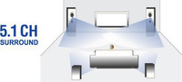 This home theatre system from Mitashi plays audio in a 5.1 channel configuration to create a surround sound effect.