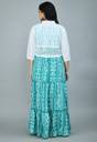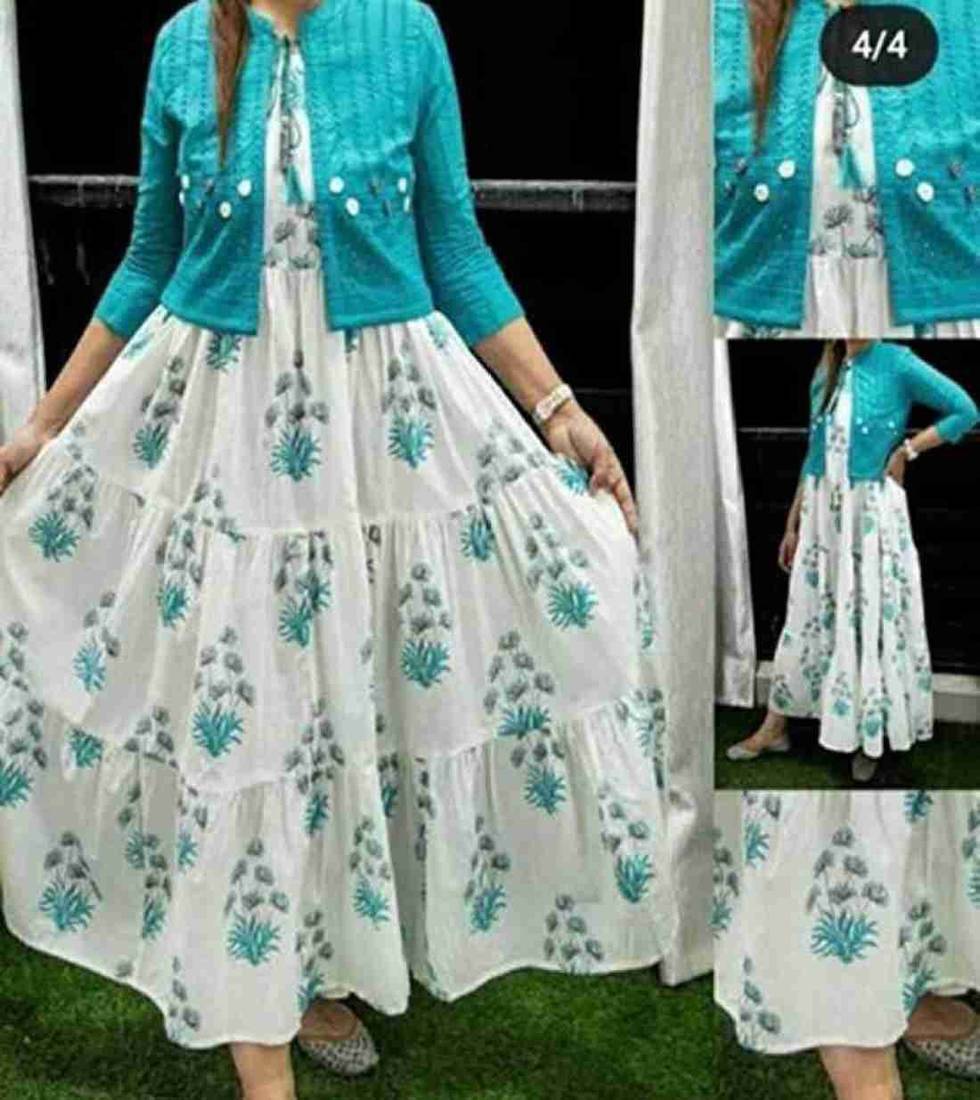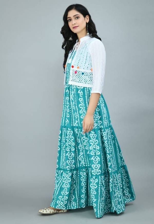 Fantastic heavy 14 kg Reyon in Jaipuri Bandhni Block printed Gown with White colour solid Chikankari work koti for fancy and latest look . wear this beautiful piece in wedding,party, function with comfortable fitting and rich fabric feel