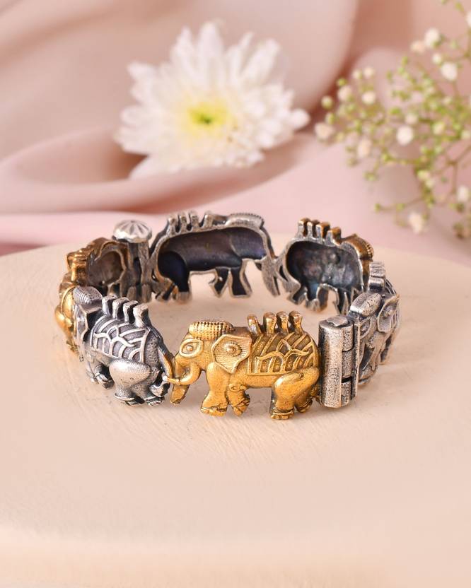 Miyana Designer Brass Kada, crafted with intricate detailing and a premium oxidised finish. This openable bangle features a majestic elephant motif, symbolizing strength and heritage. The screw-setting mechanism ensures a secure fit, while the freesize design comfortably fits most wrists. Ideal for pairing with sarees, kurtis, or Indo-western outfits, this versatile accessory adds an antique charm to weddings, festivals, or cultural gatherings. A must-have statement piece for every ethnic jewellery lover.These bangles are handcrafted and feature intricate designs, patterns, and motifs that showcase the skilled artistry of the jeweler. The oxidized finish gives these pieces a weathered and aged look, adding character and enhancing their overall aesthetic appeal. All the bangles come with a screw opening & adjustable bangle will fit any size due to the adjustment provision.