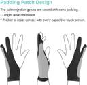 ?SPECIAL PADDING PATCH DESIGN? The drawing artist glove comes with extra padding which has longer wear resistance and thick enough to prevents smudges or unexpected palm-touch and fingerprints on capacitive touch screens.