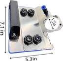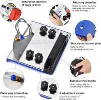 his precision cutting tool features a secure angle grinder interface, water pipe connection to reduce dust, and four adjustable screws to control cutting thickness. The blue plastic base protects tiles, while the ergonomic handle offers balance during use. Chamfer depth is easily modified for smooth, clean tile edges.