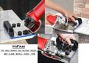 This image showcases a 45-degree tile chamfering guide used with an angle grinder. The setup ensures smooth, accurate bevel cuts on tiles, marble, or granite. Its sturdy metal base with adjustable knobs and anti-slip design provides stability and ease of use, ideal for professional tile installers and DIY users.