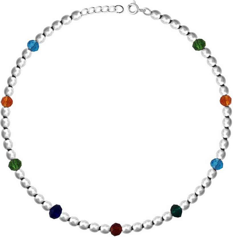 MJ 925 presents cute colourful beads threaded silver balls anklet in sterling silver. One piece of this anklet can be combined with any outfit to complete your chic look. Anklet comes with adjuster chain so as to fit and give mesmerizing look to your feet.