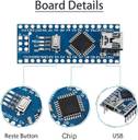 Arduino Nano is a small, complete, breadboard-friendly microcontroller board based on the ATmega328P . It has similar functionality to the Arduino Uno but in a smaller form factor. The board is widely used for embedded systems, prototyping, robotics, IoT (Internet of Things), automation projects, and educational purposes.