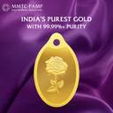 This uniquely stylised 24K, 999.9 purest gold Rose pendant comes with MMTC-PAMP’s stamp of authenticity that serves as a guarantee of the highest purity and finest craftsmanship available in the world. Each 2 gm pendant comes with the promise of positive weight tolerance which is MMTC-PAMP’s commitment to all its customers that every piece of gold that you buy from us will weigh more than what is mentioned on the pack. Always."