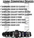 • SAMSUNG GEAR S3 CLASSIC, SAMSUNG GEAR S3 FRONTIER, SAMSUNG GALAXY WATCH 46MM, SAMSUNG GALAXY WATCH 3 45MM, SAMSUNG GEAR 2 LIVE R382, SAMSUNG GEAR 2 NEO R381, SAMSUNG GEAR 2 R380, SAMSUNG GEAR LIVE