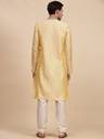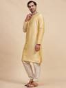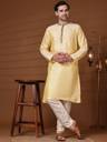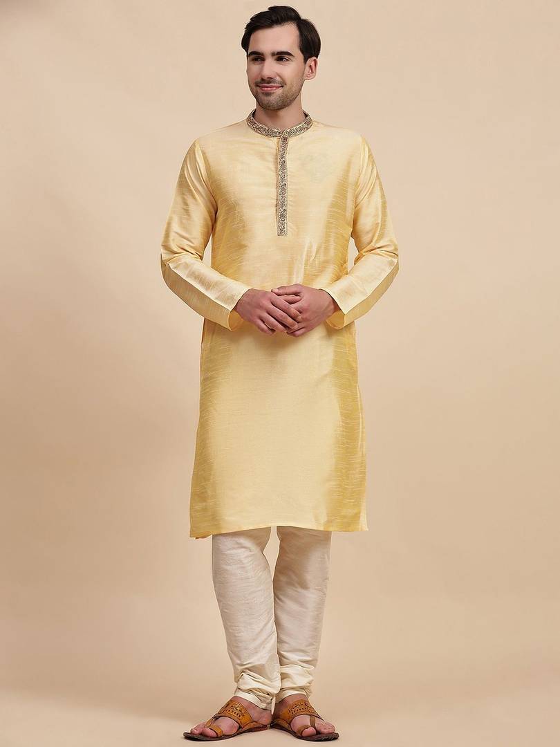 Kurta pajama set in art silk fabric, ethnic men's wear from India. Using art silk, our kurta tunic set brings together quality and style into one simple piece. A completely traditional Indian design, this kurta pajama set is handmade from the absolute finest of art silk. This kurta pajama set includes both a top and a bottom. There is beautiful embroidery around the collar and placket. Loose fitting sleeves and slits along the sides allow for an easy fit and let air circulate freely through the garment. The pant included in this kurta pajama set has a relaxed fit through the seat. Loose comfortable fitting makes it a great wear. This kurta pajama set is worn in both summer and winter. Comes with complimentary free size trouser (pajama). Chest size is displayed based on body measurement NOT actual apparel measurement. Kurta's actual chest measurement is 4 inches more than the displayed chest measurement. e.g. if Kurta's bare chest measurement is 40 inches, we display it as 40 inches or 'M'. In other words, if size measured around the fullest part of your chest is 40 inches, we recommend you buy kurta displayed as 40 inches or 'M'. The actual chest measurement of kurta you will receive would be 44 inches. Kurta sets like this is traditionally worn for everyday wear as well as for festivals and special occasions. The ways that you can wear this luxurious kurta pajama set are endless you can mix and match the pieces with other things in your wardrobe.