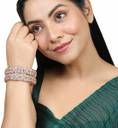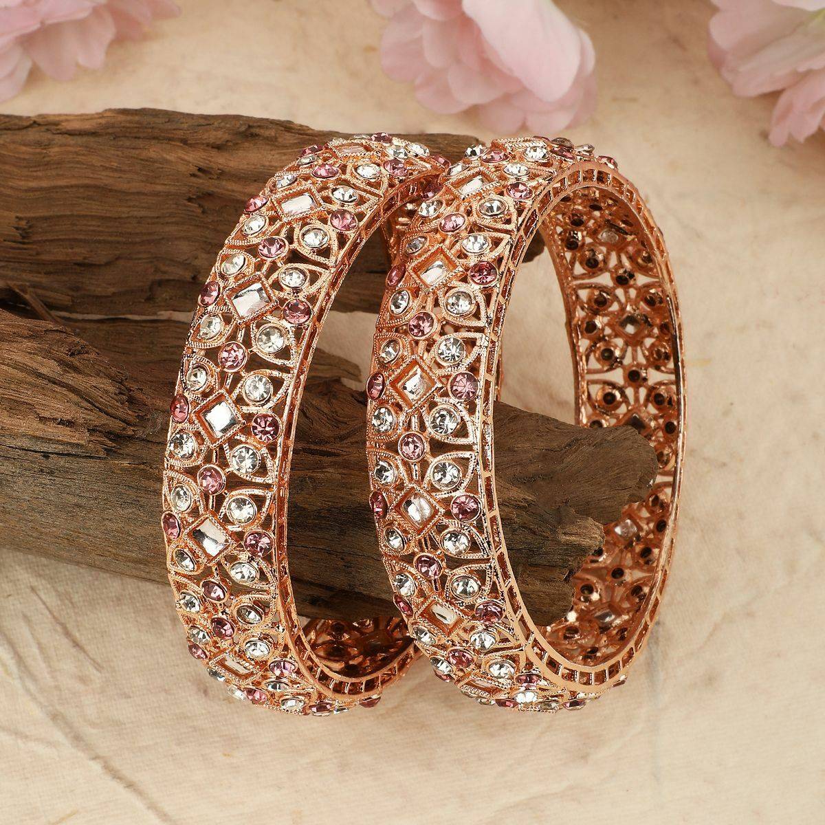 Statement Rose Gold Plated Abstract Design Stone Studded Bangle Set of 2 Bangles for Girls and Women.Women love jewellery; specially traditional jewellery adore a women. They wear it on different occasion. They have special importance on ring ceremony, wedding and festive time. They can also wear it on regular basics. Make your moment memorable with this range. This jewel set features a unique one of a kind traditional embellish with antic finish.