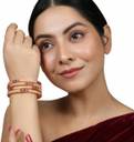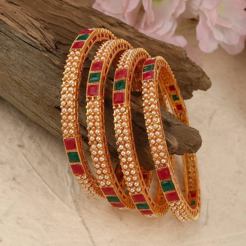 Traditional Gold plated Pearl and Multicolor Stone studded Bangle Set of 4 Bangles for Girls and Women.Women love jewellery; specially traditional jewellery adore a women. They wear it on different occasion. They have special importance on ring ceremony, wedding and festive time. They can also wear it on regular basics. Make your moment memorable with this range. This jewel set features a unique one of a kind traditional embellish with antic finish.