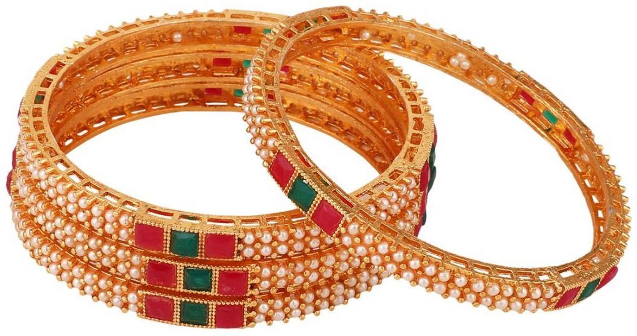 Traditional Gold plated Pearl and Multicolor Stone studded Bangle Set of 4 Bangles for Girls and Women.Women love jewellery; specially traditional jewellery adore a women. They wear it on different occasion. They have special importance on ring ceremony, wedding and festive time. They can also wear it on regular basics. Make your moment memorable with this range. This jewel set features a unique one of a kind traditional embellish with antic finish.