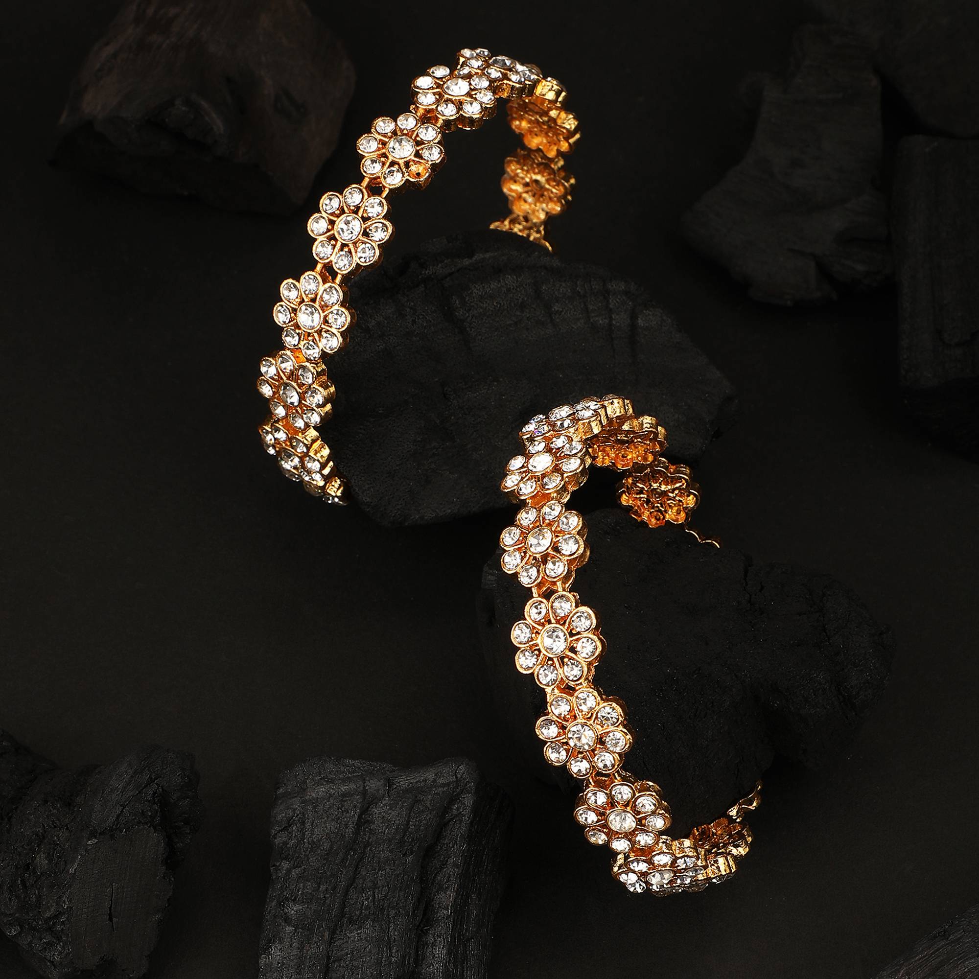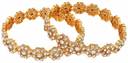 Statement Gold Plated Floral Shaped Stone Studded Bangle Set of 2 Bangles for Girls and Women.Women love jewellery; specially traditional jewellery adore a women. They wear it on different occasion. They have special importance on ring ceremony, wedding and festive time. They can also wear it on regular basics. Make your moment memorable with this range. This jewel set features a unique one of a kind traditional embellish with antic finish.