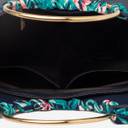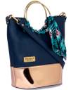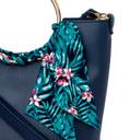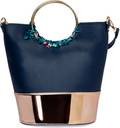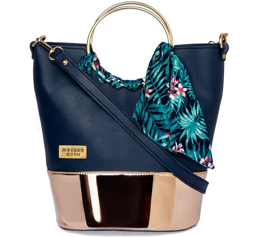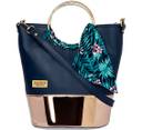 Made using smooth-finish blue and mirror-finish rose gold vegan leather (Cruelty-Free) - Gold-tone circular handles interwoven with printed fabric for handheld use - Diameter of circular handles – 5 inches - Stiff bucket shaped structure - Convertible between cross-body and handheld bag - Detachable shoulder belt expandable up to 60” in length - Spacious enough to carry all essentials - Patchwork detailing - Secure zip fastening at the top - Microfiber lining with spacious central compartment, internal zip pocket and 2 open slots - Hard bottom - Handcrafted in India