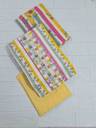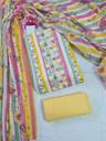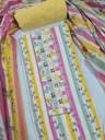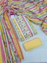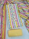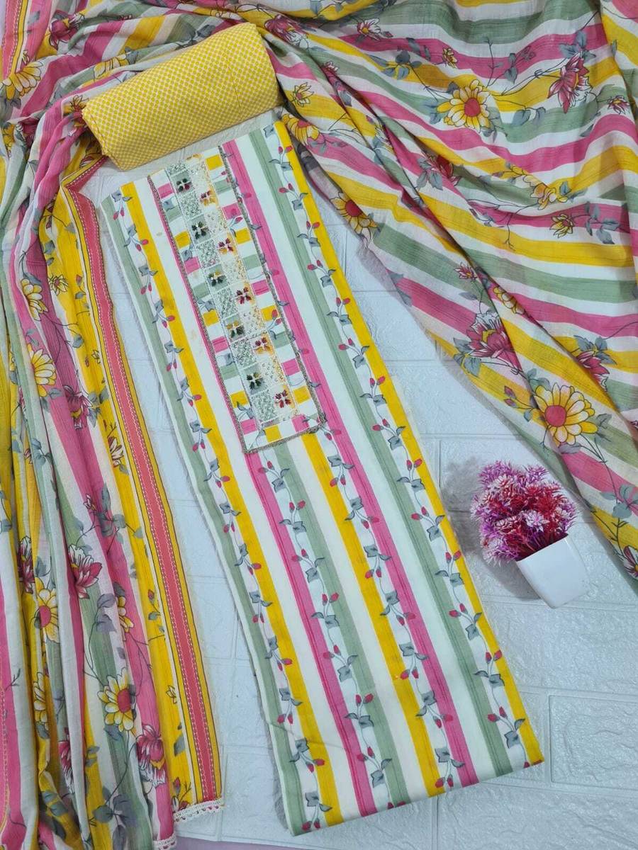 Brighten up your wardrobe with this vibrant and chic unstitched dress material! The top features eye-catching vertical stripes in shades of pink, yellow, and green, giving it a fresh and modern look. The yoke is beautifully detailed with mirror work and crochet lace, adding a touch of traditional elegance. The accompanying cotton dupatta features a lovely floral pattern that perfectly complements the stripes, making this a stylish and versatile choice.